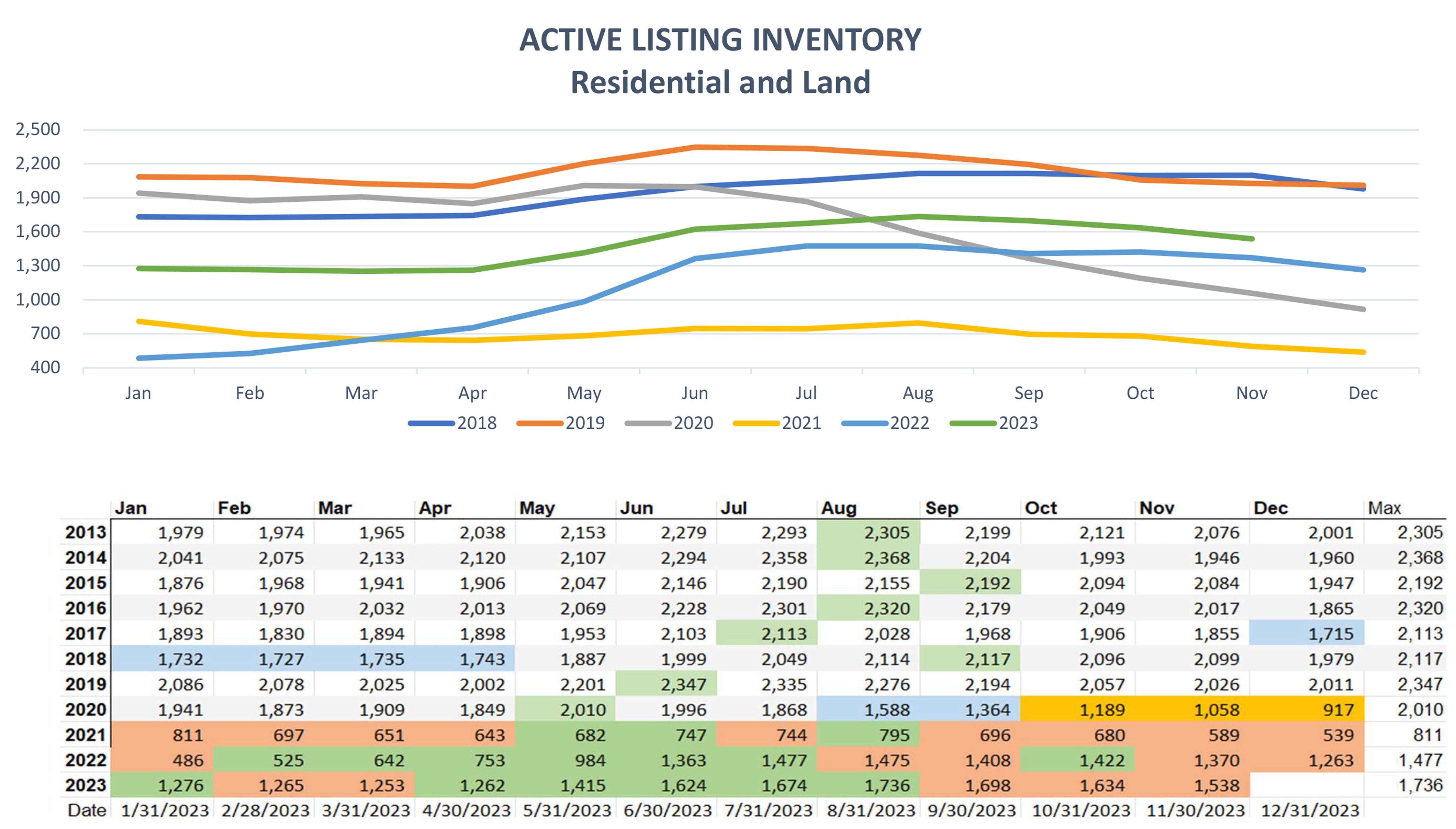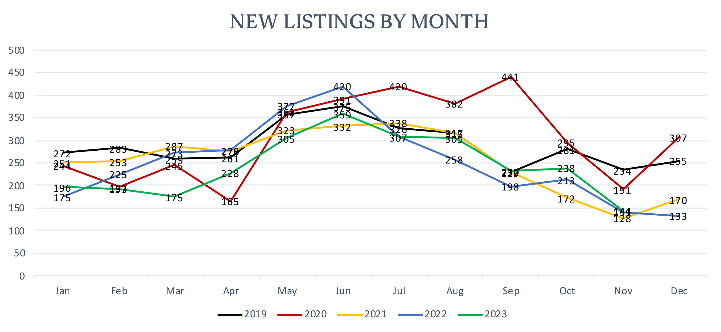 New Listings: New listings, which were being added to the system at a rate of around 200 per month for the first four months of 2023, jumped to over 300 in May and remained steady at over 300 each month until the annual fall slowdown started in September. As the inventory graph below shows, active inventory was 1,736 at the end of August, the highest since July 2020. It has been slipping each month since, which is totally expected as we roll into the holidays.
