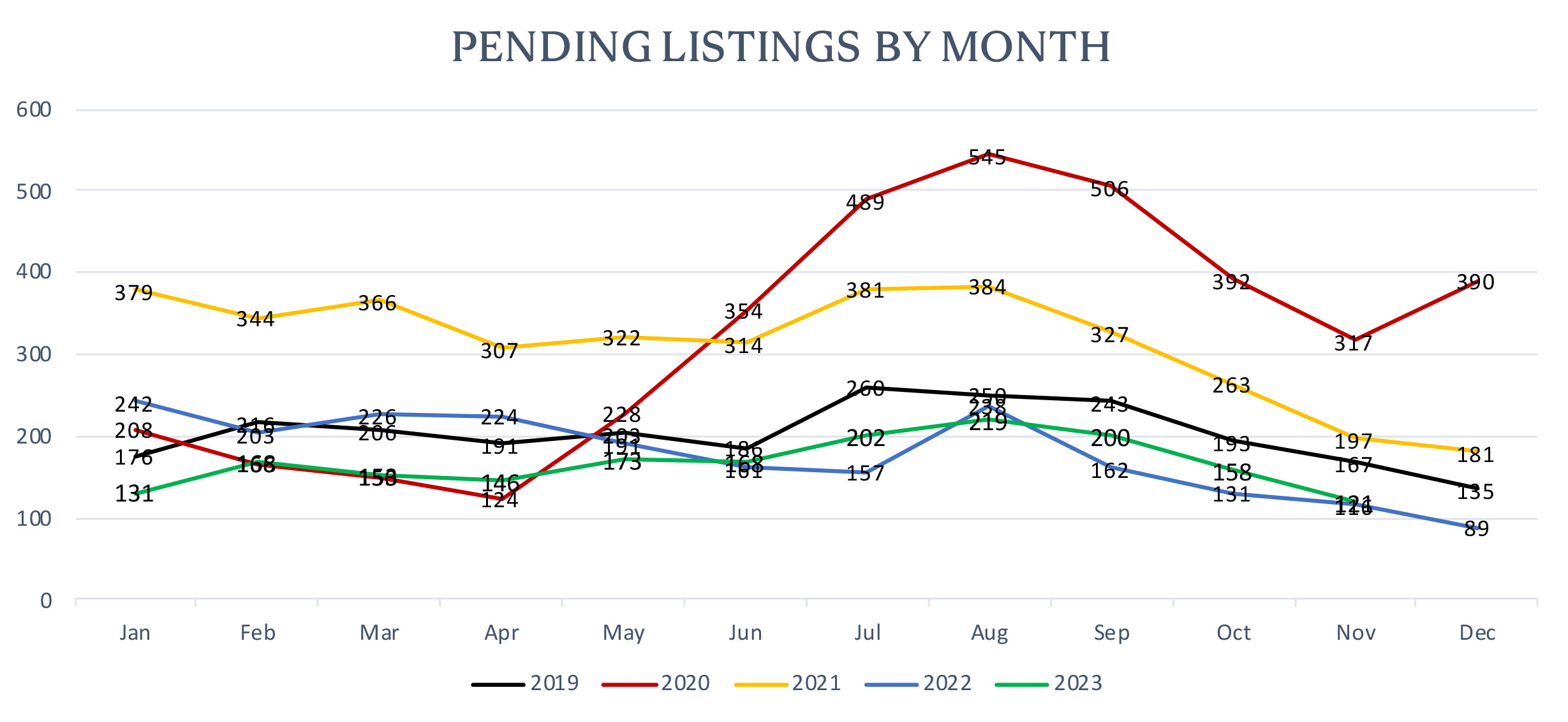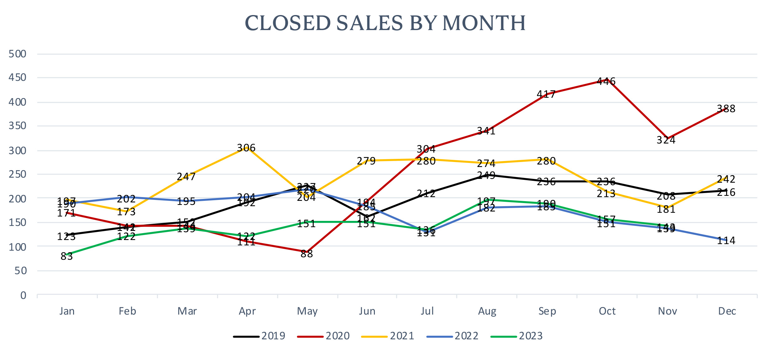 Closed Sales: 2022 showed a return to almost the same sales pace as we saw in pre-Covid 2019. 2,098 sales closed in 2022, just 255 fewer than sold in 2019 but 27% below 2021’s total (2,876). January 2023 retained its title as the slowest sales month in the past five years with just 83 sales. February and March posted month-over-month increases but still tallied 29-40% lower than a year earlier. From April through July, sales have fluctuated between 120 and 150. The 196 August closings were the highest monthly tally this year and the most in any month since May of 2022. From September through November, monthly sales declined, not unusual for this time of year.